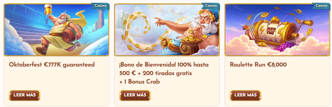 - Bono de Bienvenida – 100% hasta 500 € + 200 tiradas gratis + 1 Bonus Crab.