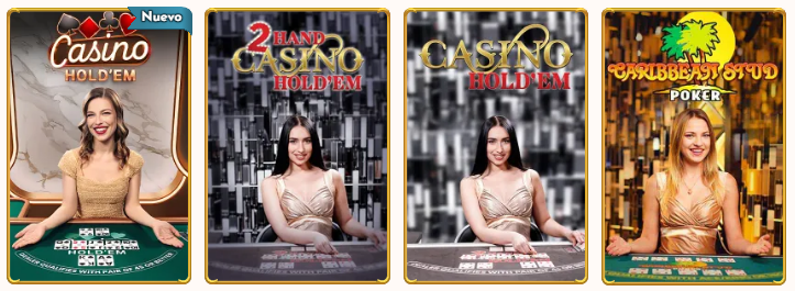 - Póker: modalidades de vídeo póker, Caribbean Stud, Texas Hold’em y póker en vivo.