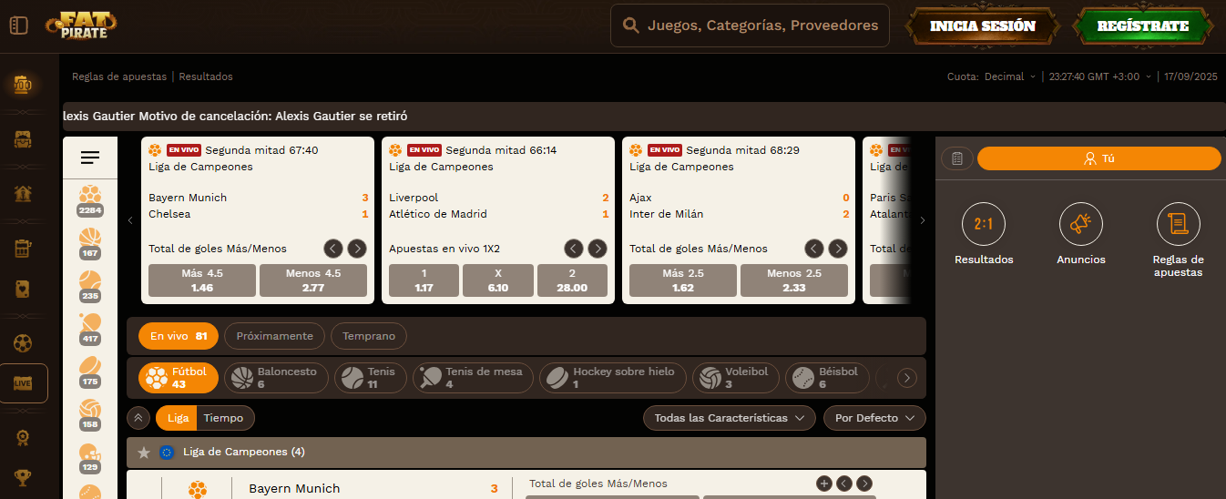 Este enfoque convierte a FatPirate en una plataforma híbrida: combina casino online con apuestas deportivas en vivo y virtuales, ofreciendo una experiencia más amplia para el jugador.