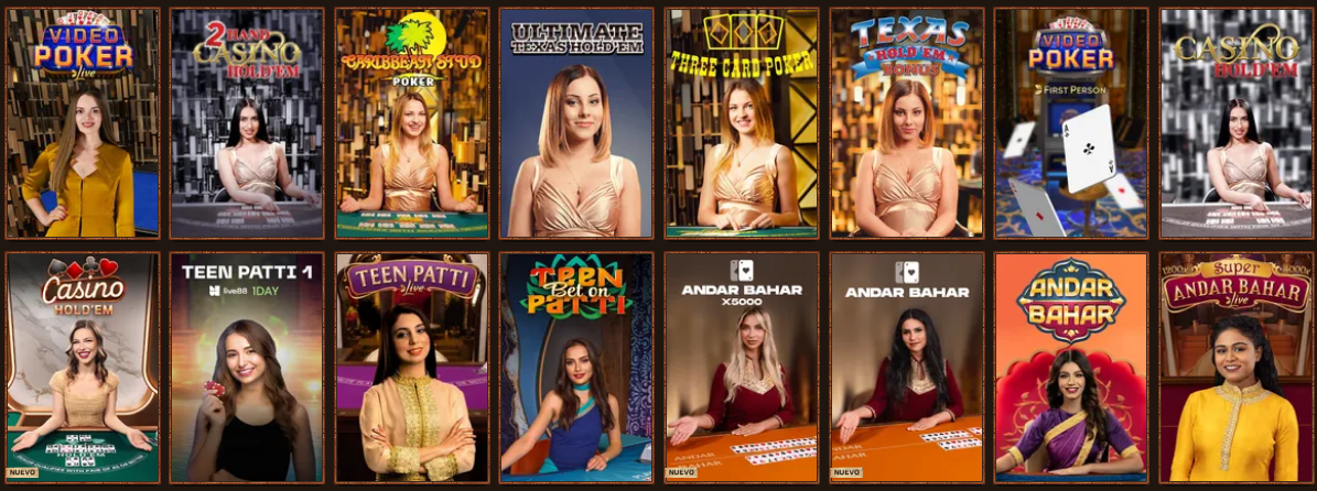 - Póker: Texas Hold’em, Caribbean Stud, Three Card Poker y variantes.