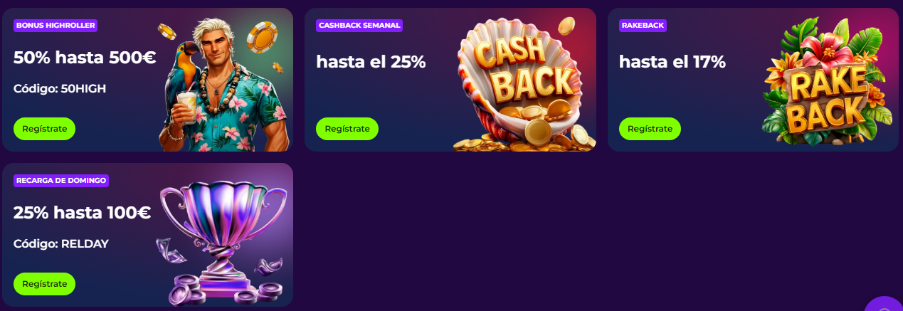 Términos: se calcula sobre volumen/apuestas elegibles; no suele aplicarse a fondos de bono. - Recarga de domingo: 25% hasta 100 € (código RELDAY).