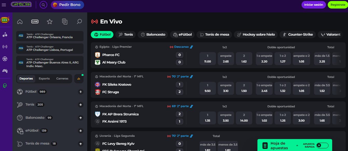 Además de su completo catálogo de slots y juegos de mesa, Gambloria ofrece una sección de apuestas deportivas y virtuales que incluye tanto competiciones reales como simulaciones. Los jugadores pueden apostar en partidos de fútbol, tenis, baloncesto, hockey o deportes de eSports como Counter-Strike y Valorant, junto con carreras virtuales y ligas rápidas.