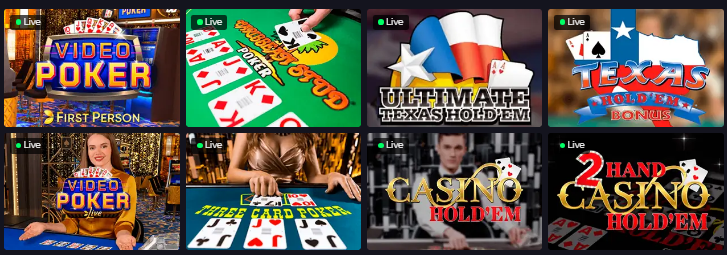 - Video Poker (First Person y Live): opción ideal para quienes buscan partidas rápidas sin esperar turno.