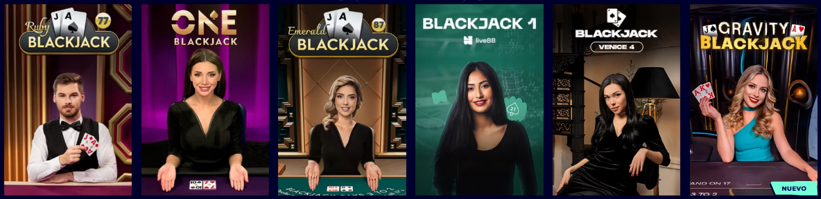 - Blackjack en Vivo: mesas con crupieres reales transmitidas en alta definición, que reproducen la atmósfera de un casino físico.