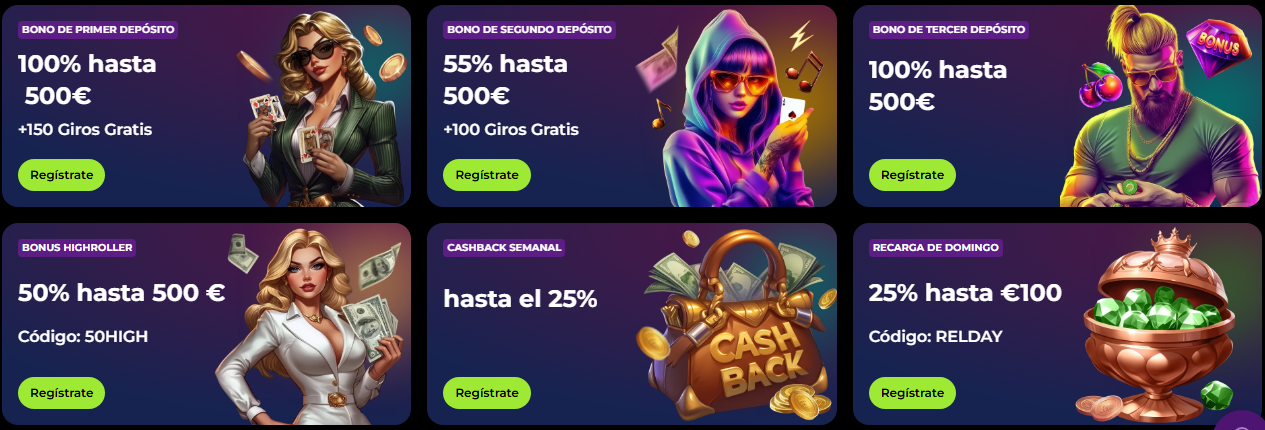 - High Roller: 50% hasta 500 € con código 50HIGH (depósito alto), rollover 35x y validez corta tras activación.