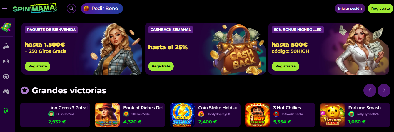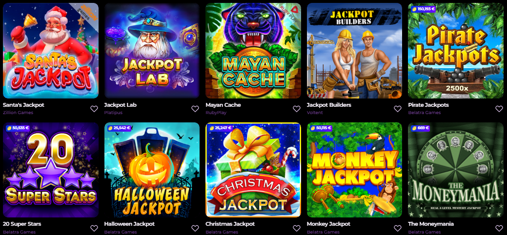 SpinMama cuenta con una selección atractiva de tragamonedas con bote (jackpot), que incluyen tanto premios progresivos como acumulados fijos. Estos juegos permiten optar a grandes sumas con una sola tirada, lo que los convierte en una de las secciones más buscadas por los jugadores.