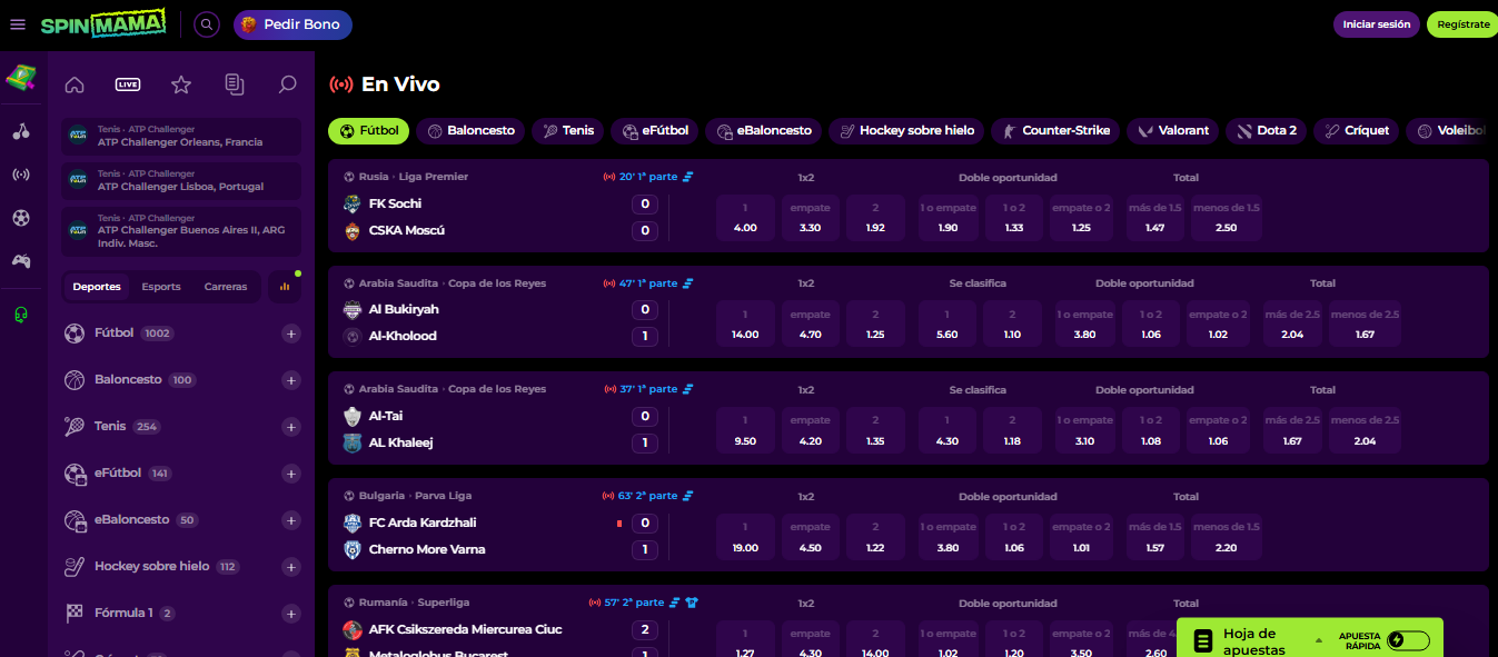 Los deportes virtuales en SpinMama están diseñados para jugadores que desean apuestas rápidas y frecuentes, con mercados similares a los tradicionales: ganador del partido, número de goles/puntos, hándicap y totales. Esto convierte la sección en una opción atractiva para quienes buscan entretenimiento sin pausas largas.