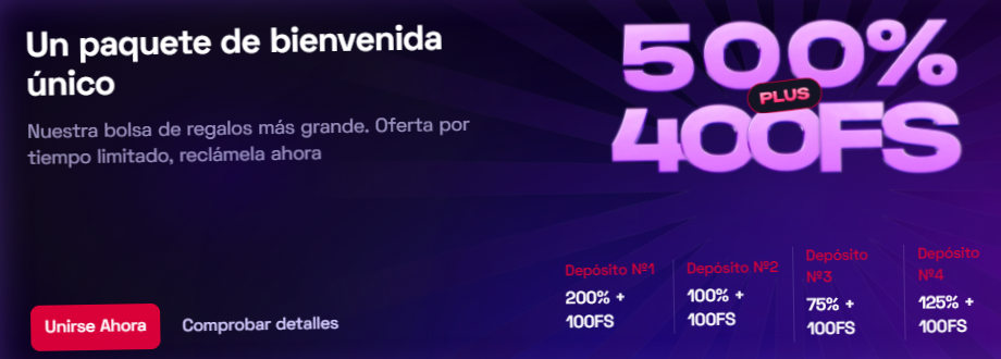 - Bienvenida (4 depósitos): 200% +100 FS · 100% +100 FS · 75% +100 FS · 125% +100 FS.