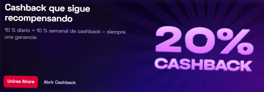 - Cashback: 20 % total (10 % diario + 10 % semanal).