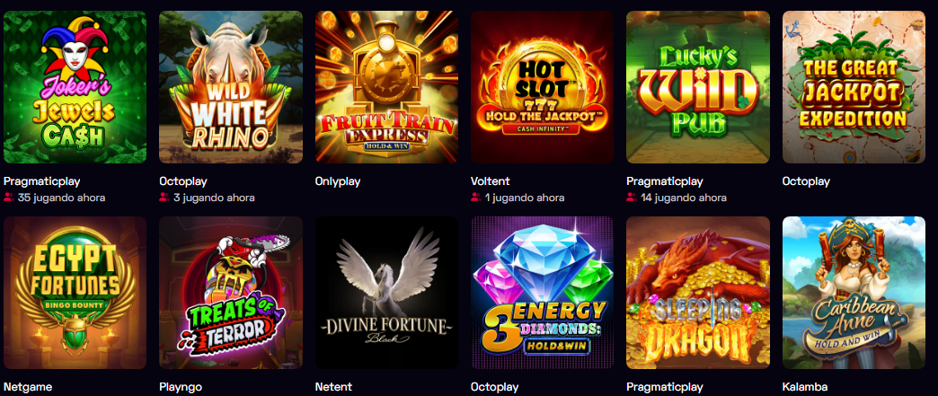 - 💎 Jackpots: progresivos y fijos (diarios/horarios), selección dedicada dentro de la sección de slots.