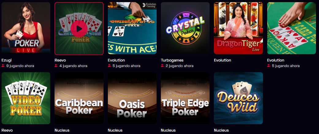 - Póker RNG (mesa): Caribbean Poker, Oasis Poker, Triple Edge Poker.