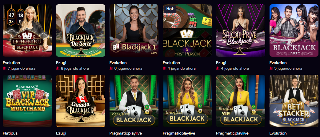 - Variantes: Clásico 3:2, Lightning Blackjack (multiplicadores), First Person (RNG), Multihand, Party, Salon Privé/VIP, mesas localizadas (Brazilian, Canada, Da Sorte).