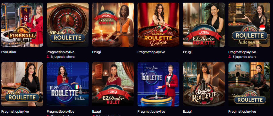 - Mesas en vivo destacadas: Evolution (Fireball Roulette Live); Pragmatic Play Live (VIP Auto Roulette, Immersive Roulette Deluxe, Mega Roulette, French/Vietnamese/Indonesia/Italia); Ezugi (EZ Dealer Roulette en varias versiones y Skyline Roulette).