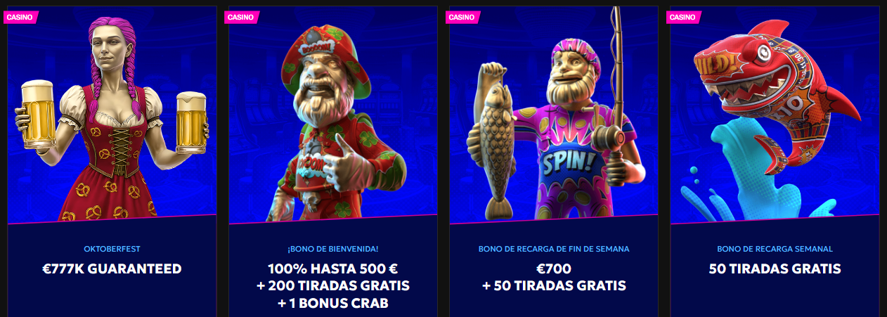 - Bono de Bienvenida: 100 % hasta 500 € + 200 tiradas gratis + 1 Bonus Crab.