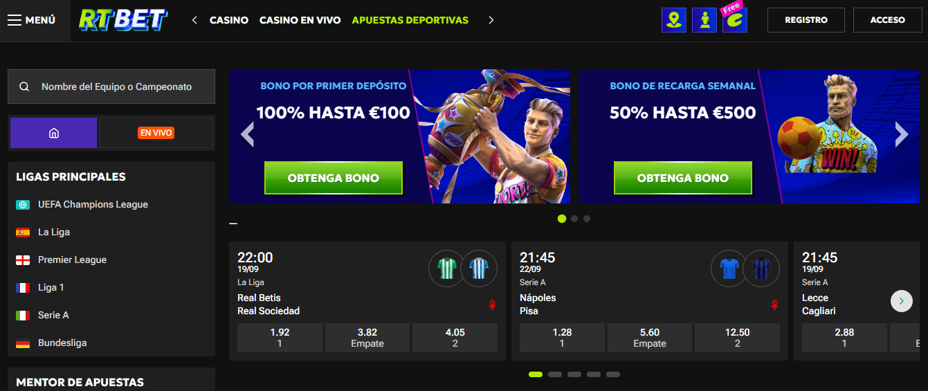 En RTBet Casino, además de los juegos de azar tradicionales, los usuarios pueden disfrutar de las apuestas en deportes virtuales. Estos simulan partidos y competiciones reales mediante software con gráficos avanzados, ofreciendo acción continua sin depender de calendarios deportivos. Es una alternativa ideal para quienes buscan emoción rápida y resultados inmediatos.